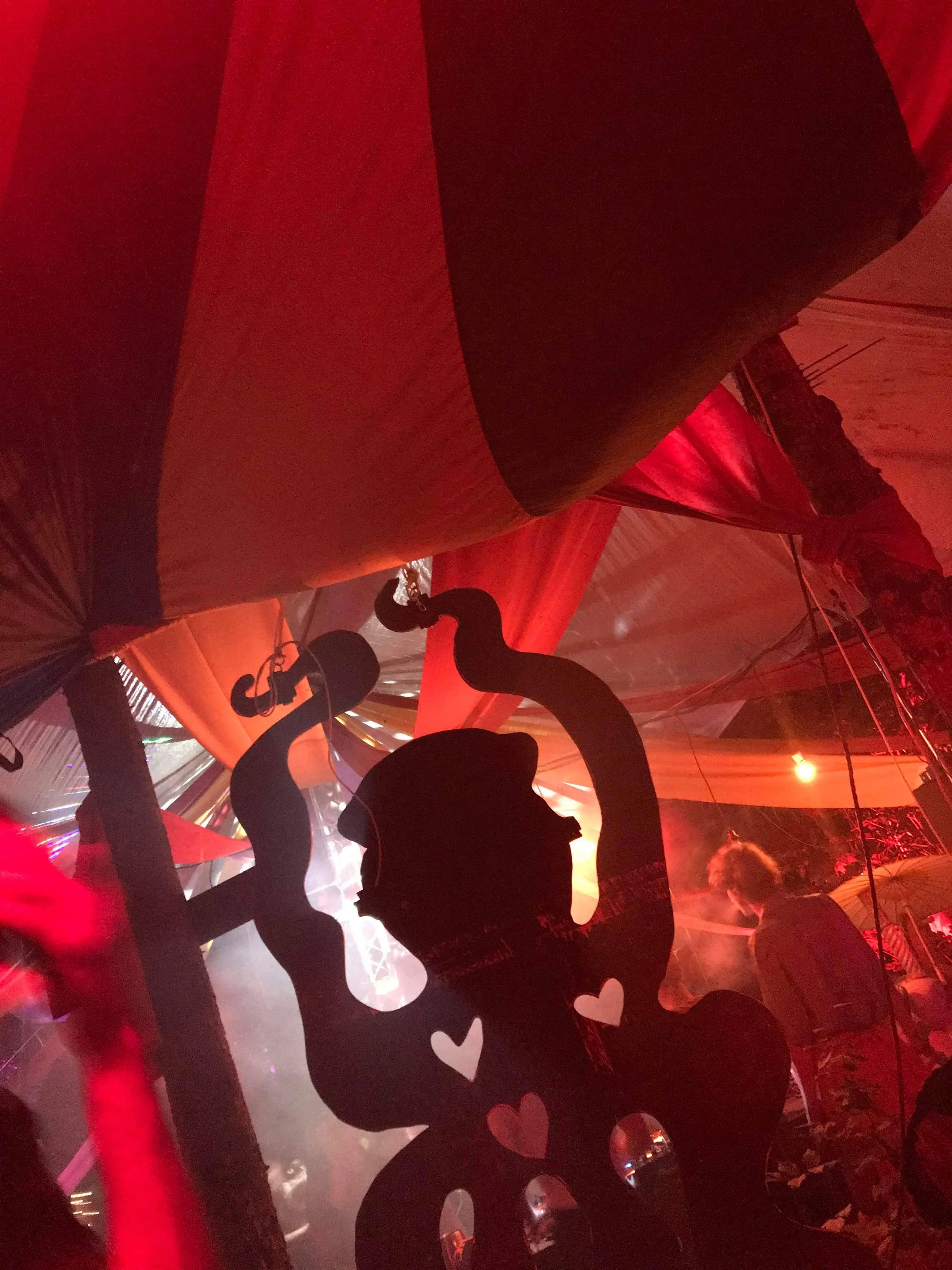 Ker-MESS is a sound camp I founded for l’Osstidburn, Quebec's Regional Burning Man event. The name comes from the French expression for 'carnival,' and the camp was built around a circus theme. It featured a big top-covered dance floor, a tarot reading tent, and a VIP section nestled under a parachute. The camp had 24 members and hosted activities over three days, including techno raves, burlesque performances, carnival games, and food pop-ups.
