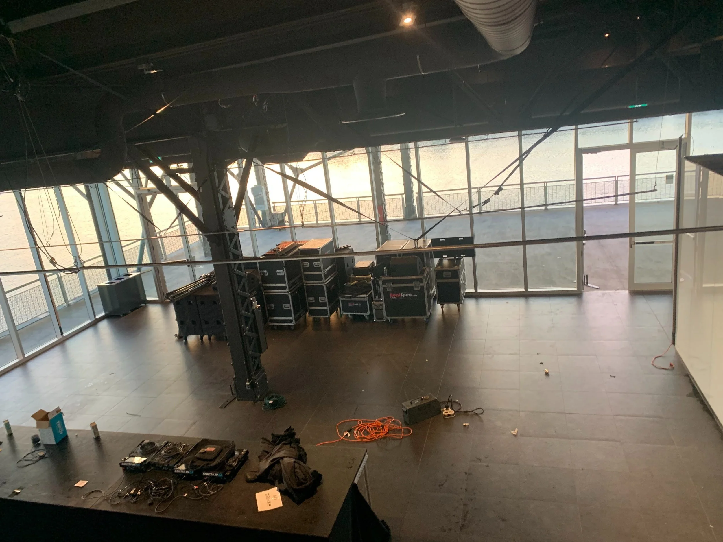 Installing the lights was more complex than I anticipated. I led. a team of 8 people during the installation. I had designed a metal wire system to hang them with clamps from ceiling H-beams. To do so, I used steel wire and aluminum crimps. However, I hadn't realized that the ceiling was slanted. There was around a 1.5’ ceiling height difference between both ends of the room. My team and I had to rebuild the cables on the fly using new crimps, zip ties, and ingenuity. We looped the cables and shortened them to make sure that everything was totally flat.